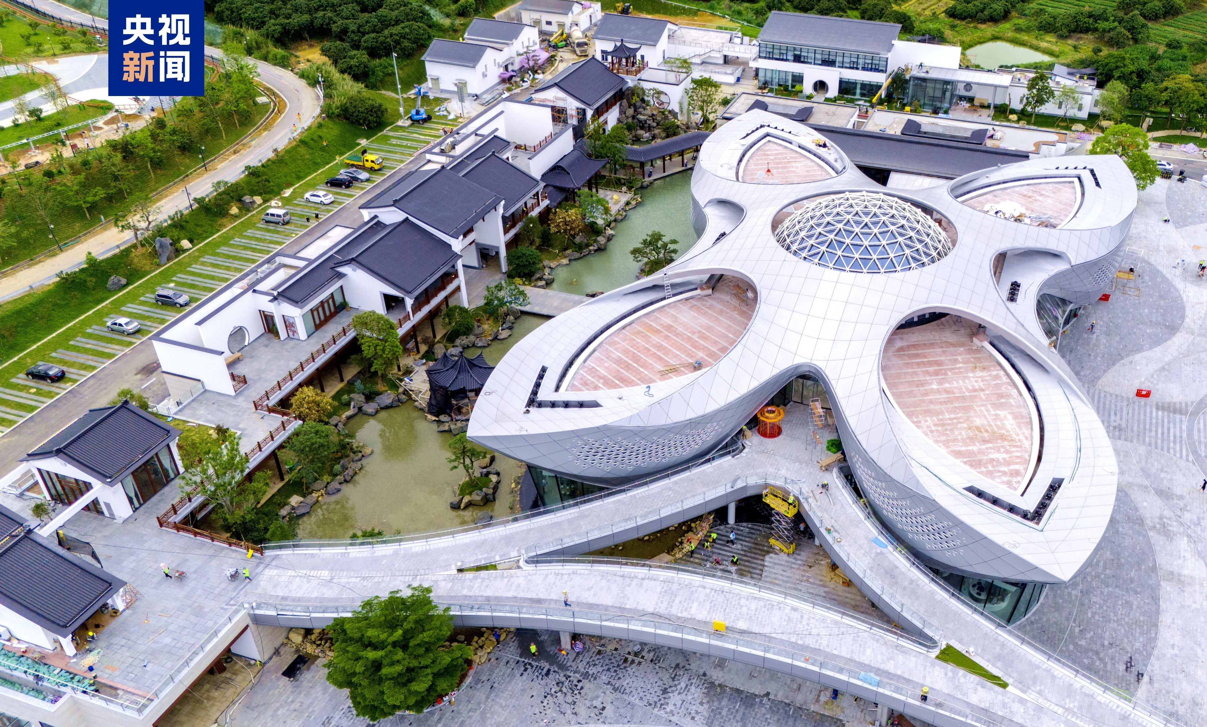 服务区西区综合体验馆如“破壳荔果”,四片舒展的弧形屋面如初绽的荔叶,轻盈托起晶莹的玻璃穹顶;西区裙楼,亭、廊、轩等仿古建筑组群相互呼应,瀑布、岸石、小桥穿插其中,构成了一座微缩岭南园林。